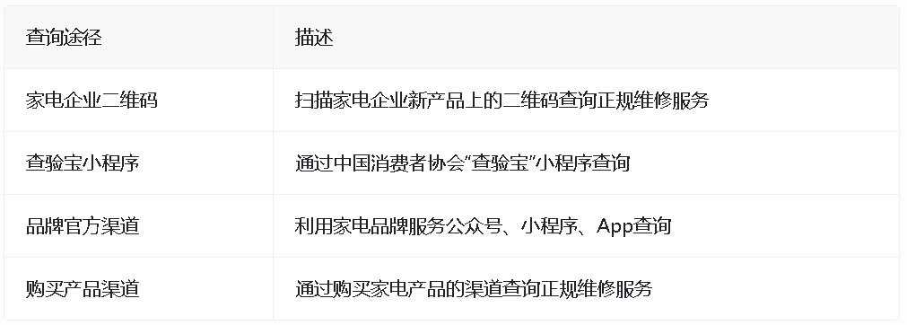 - 家电品牌服务公众号、小程序、App:利用家电品牌官方渠道查询维修服务。