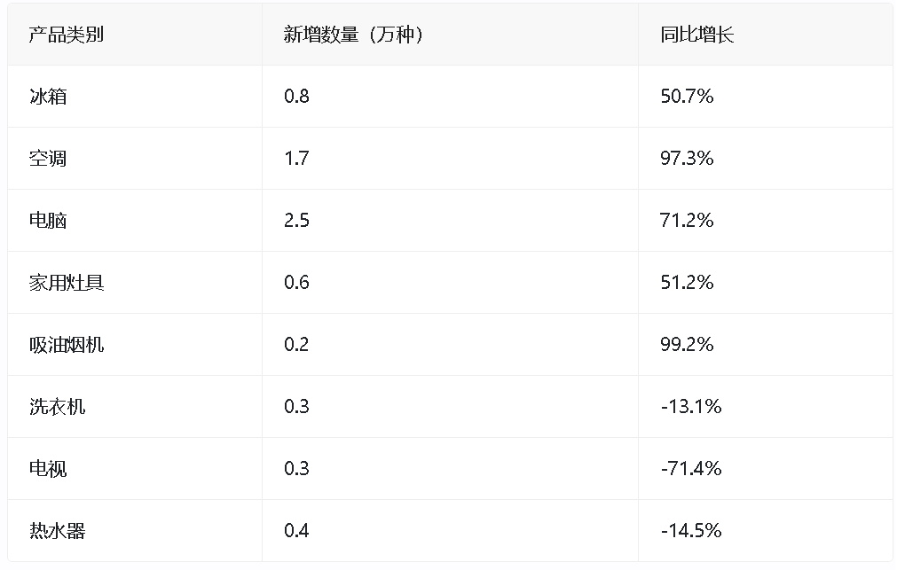 然而,洗衣机、电视和热水器等三类产品的增长则相对放缓,甚至出现了负增长。洗衣机新增0.3万种,同比下降13.1%;电视新增0.3万种,同比大幅下降71.4%;热水器新增0.4万种,同比下降14.5%。这种增长态势的差异,从一定程度上反映了居民在家电、家装等领域的消费结构正在发生新的变化。