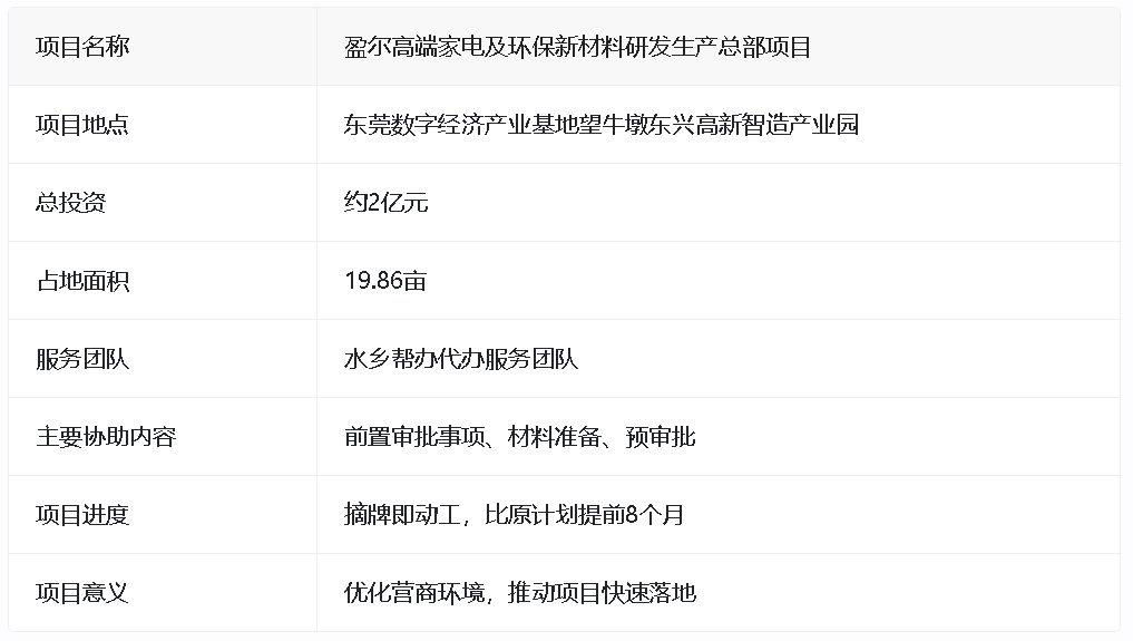 近日,东莞数字经济产业基地迎来了一项重大进展,总投资约2亿元的盈尔高端家电及环保新材料研发生产总部项目成功摘牌,落户望牛墩东兴高新智造产业园。在水乡帮办代办服务团队的协助下,该项目实现了“摘牌即动工”的高效模式,比原立项计划提前了8个月,极大地压缩了项目建设周期。