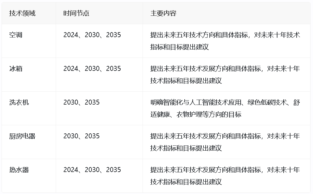 表格:2024年中国家用电器技术大会发布的技术路线图概览,注:以上内容根据2024年中国家用电器技术大会发布的信息整理。
