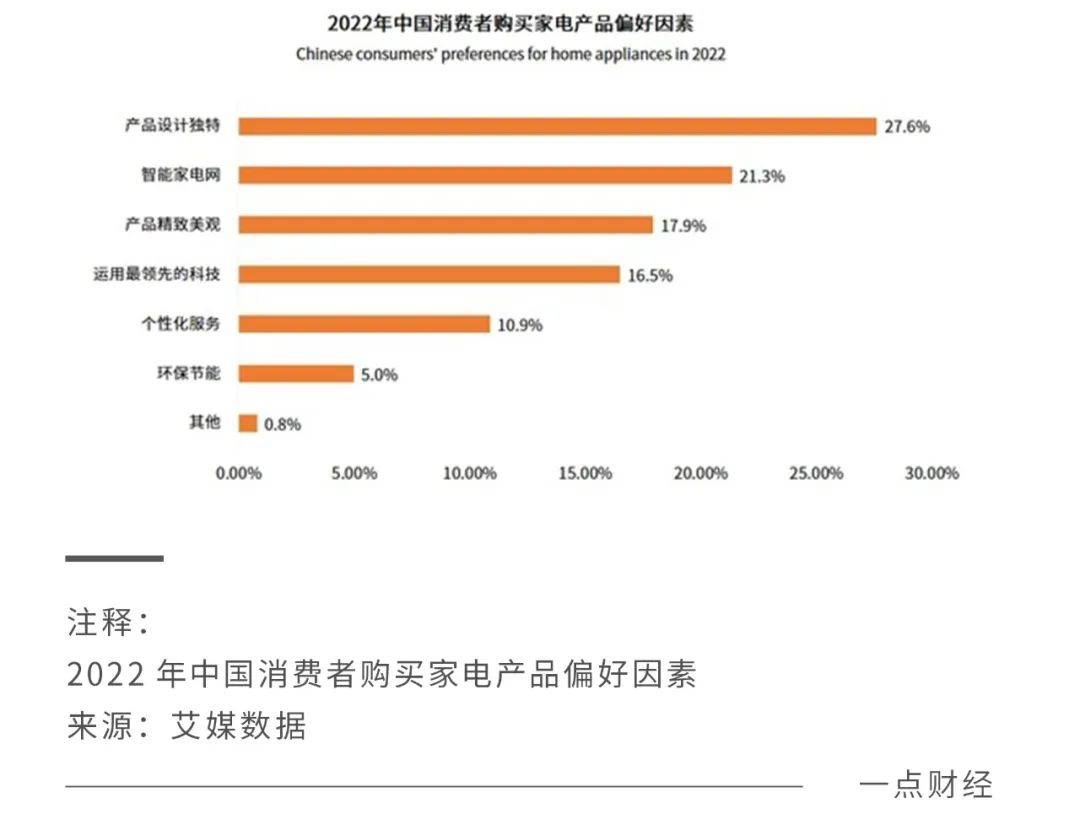 整体上看,国民消费结构仍然处于升级趋势,而消费升级迸发的新需求推动着家电产品的迭代更新。艾媒咨询报告显示,产品设计独特、智能家电网、产品精致美观已经成为2022年中国消费者购买家电产品偏好因素中的前三甲。