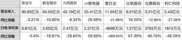 总体来看,小家电企业业绩下滑,苏泊尔营收规模最大,小熊电器增长幅度最快,比依股份与爱仕达一升一降,规模逐渐接近,利仁科技与北鼎股份也如此。