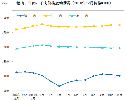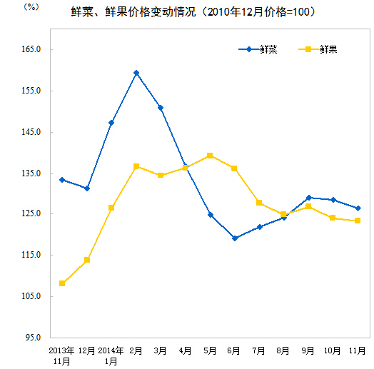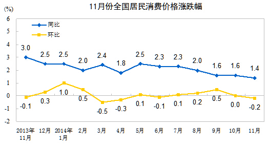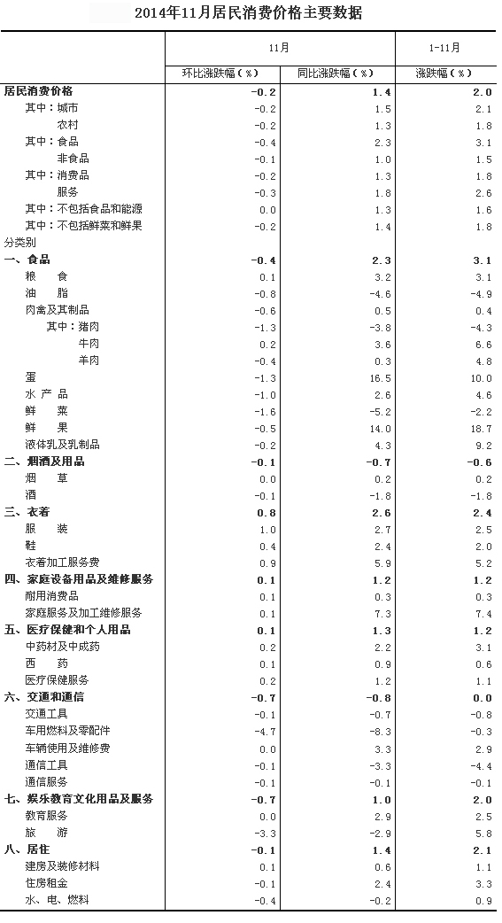 2014年11月份,全国居民消费价格总水平同比上涨1.4%。其中,城市上涨1.5%,农村上涨1.3%;食品价格上涨2.3%,非食品价格上涨1.0%;消费品价格上涨1.3%,服务价格上涨1.8%。1-11月平均,全国居民消费价格总水平比去年同期上涨2.0%。