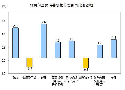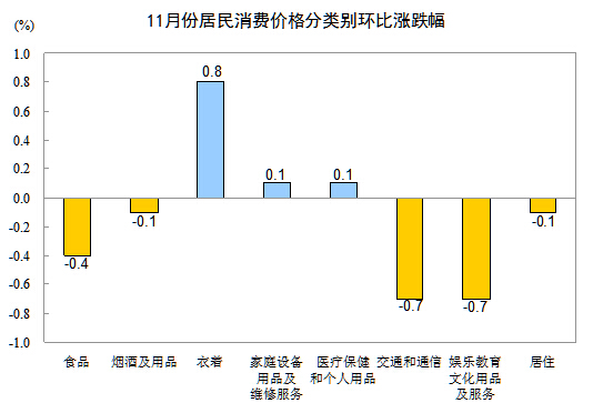 11月份,非食品价格环比下降0.1%。其中,交通和通信、娱乐教育文化用品及服务、烟酒及用品、居住价格分别下降0.7%、0.7%、0.1%和0.1%;衣着、家庭设备用品及维修服务、医疗保健和个人用品价格分别上涨0.8%、0.1%和0.1%。