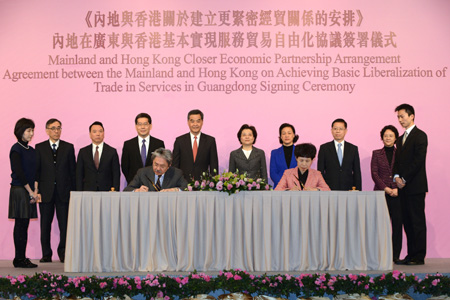 12月18日,《关于内地在广东与香港基本实现服务贸易自由化的协议》在港签署,《协议》即日生效并在2015年3月1日实施。商务部表示,《协议》签署后,内地将在广东率先与香港基本实现服务贸易自由化,同时为内地全境与香港基本实现服务贸易自由化先行先试积累经验。此间特区政府及工商界人士认为,《协议》为内地对香港开放市场带来突破性的发展,有利于进一步推进两地经济融合。