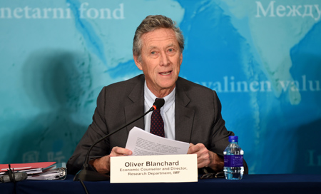 图为当日国际货币基金组织首席经济学家奥利维耶·布朗夏尔介绍《世界经济展望报告》最新预测。(记者 李鑫)(来源:经济参考报)