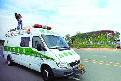 在苏迪曼杯举办期间,市环保局工作人员每天在场馆周边进行空气质量监测。 胡国球 摄