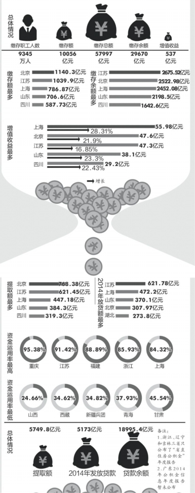 从目前已经公布年报的30省份以及作为省级行政单位的新疆生产建设兵团的情况看,2014年各省份公积金增值收益至少达537亿元。