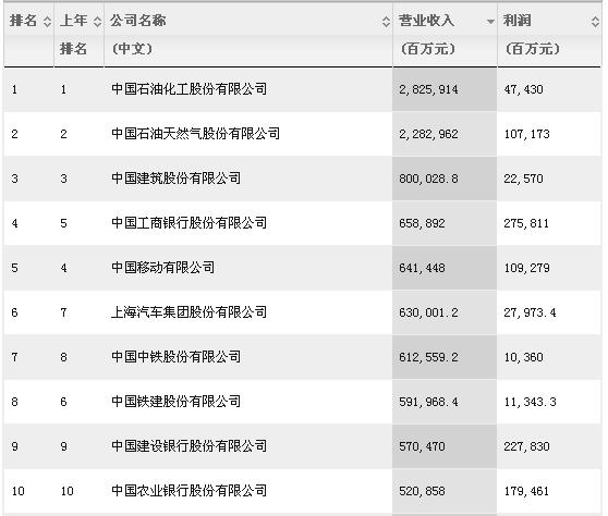 从营业收入排行看,榜单前三名的位次与去年没有变化,中石化以2.8万亿元的收入卫冕榜首,中石油、中国建筑[10.07% 资金 研报]分列第二、第三位。