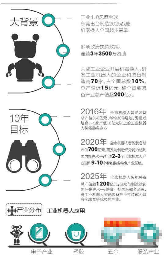 近年来东莞已有六成工业企业开展“机器换人”,研发工业机器人的企业和工业机器人装备制造商有约70家,机器人企业数已占全国总数的10%,工业机器人产业总产值近15亿元,整个智能装备产业总产值逾200亿元。