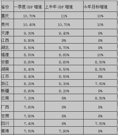 从26个省份公布的半年报看,重庆、贵州是仅有的两个GDP增速保持在两位数的省份,分别为11%和10.7%。