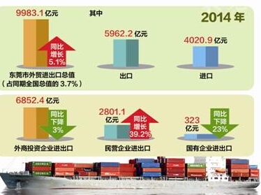 海关数据显示,2014年东莞市外贸进出口总值为9983.1亿元(占同期全国总值的3.7%),同比增长5.1%。出口5962.2亿元、进口4020.9亿元。其中,外商投资企业进出口6852.4亿元,下降3%;民营企业进出口2801.1亿元,增长39.2%;国有企业进出口323亿元,下降23%。(来源:东莞日报)