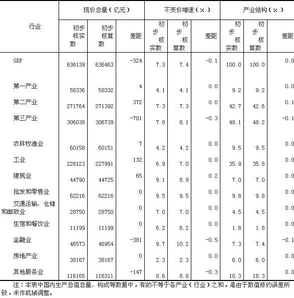 经初步核实,2014年GDP现价总量为636139亿元,比初步核算数减少324亿元,按不变价格计算的增长速度为7.3%,比初步核算数降低0.1个百分点。其中,第一产业增加值为58336亿元,比初步核算数增加4亿元,增长速度为4.1%,与初步核算数持平。第二产业增加值为271764亿元,比初步核算数增加372亿元,增长速度为7.3%,与初步核算数持平。第三产业增加值为306038亿元,比初步核算数减少701亿元,增长速度为7.8%,比初步核算数降低0.3个百分点。按初步核实数计算的三次产业结构,第一产业占9.2%,第二产业占42.7%,第三产业占48.1%。