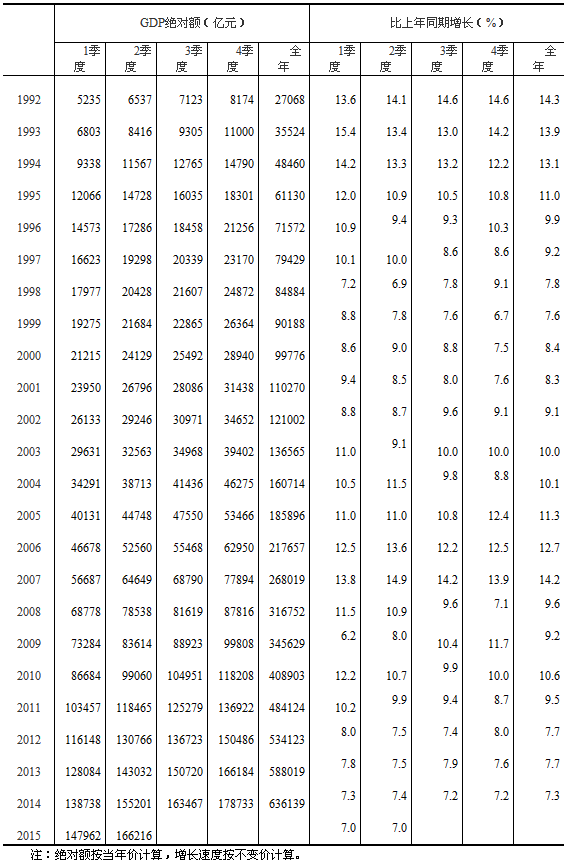 据统计局网站9月9日消息,为适应分季GDP核算改革的要求,国家统计局对1992年以来的季度GDP数据进行了全面修订。数据显示,修订后中国2015年一季度GDP同比增长7.0%,二季度GDP为增长7.0%。