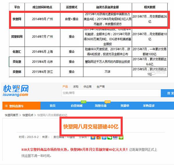 2015年9月2日,一篇题为《快塑网:单月交易额破40亿 创B2B大宗塑料行业纪录》的文章引起行业关注,文章报道了“快塑网”8月份单月交易额突破40亿元的消息。没错,就是这家并不认可撮合交易业务的“快塑网”,做出了单月交易额40亿元的惊人业绩,其风头直逼全盛时期的一亩田。