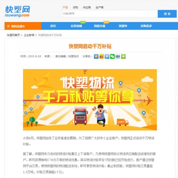 8月中旬,“快塑网”在官网宣布启动千万物流补贴,凡使用“快塑网”协议物流供应商配送或储存的客户,即可获得每吨5~35元不等的物流优惠。其实“快塑网”的物流补贴早在7月初就已经开始进行,客户通过“快塑网”平台交易,使用“快塑网”的物流配送系统,即可享受物流补贴,通过启动物流补贴,“快塑网”自营业务取得一定幅度的增长。
