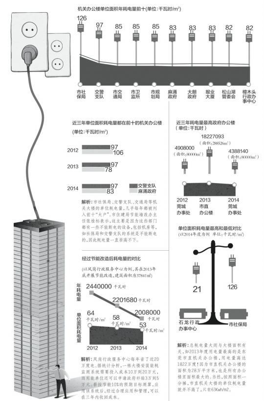日前,东莞市住房和城乡建设局公布了部分国家机关办公建筑和大型公共建筑2014年度的建筑用电量。其中,市社保局、交警支队、交通局等和往年一样,再次列入最“耗电”的前十行列。也有一些办公楼比如凤岗行政办事中心,在引入节能改造后,用电量逐年下降,每年可省电量近20万度。市住建局节能墙改办主任张桂标表示,公布耗电量排名就是希望引起社会重视,引导和督促节能环保。
