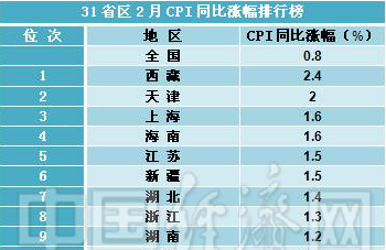 31省区2月CPI涨幅排行榜发布 2017年2月全国居民消费价格总水平同比上涨0.8%,据中国经济网记者疏理数据显示,31省区市中CPI涨幅超过全国水平的有14地...