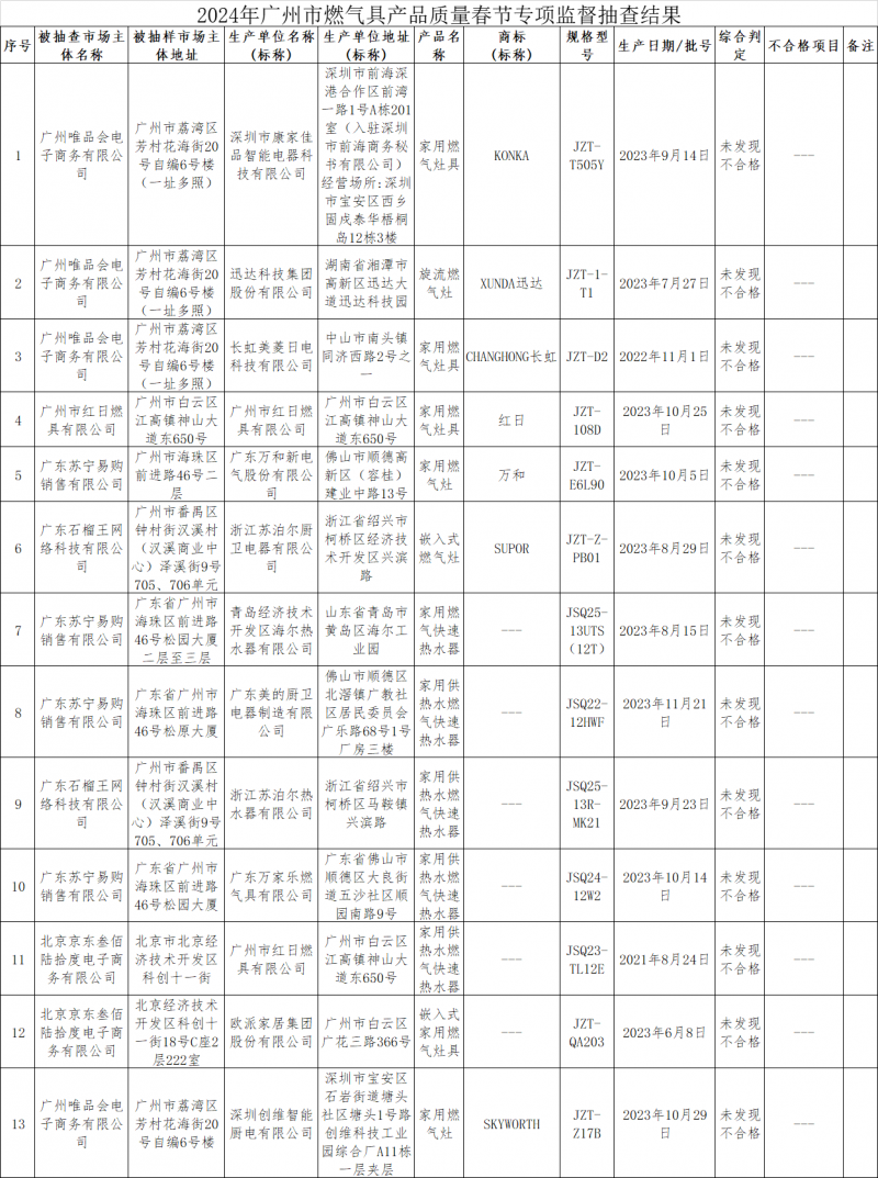 近日,广州市市场监督管理局对燃气用具产品进行了专项监督抽查,共抽查了13批次样品,经检验,未发现不合格。