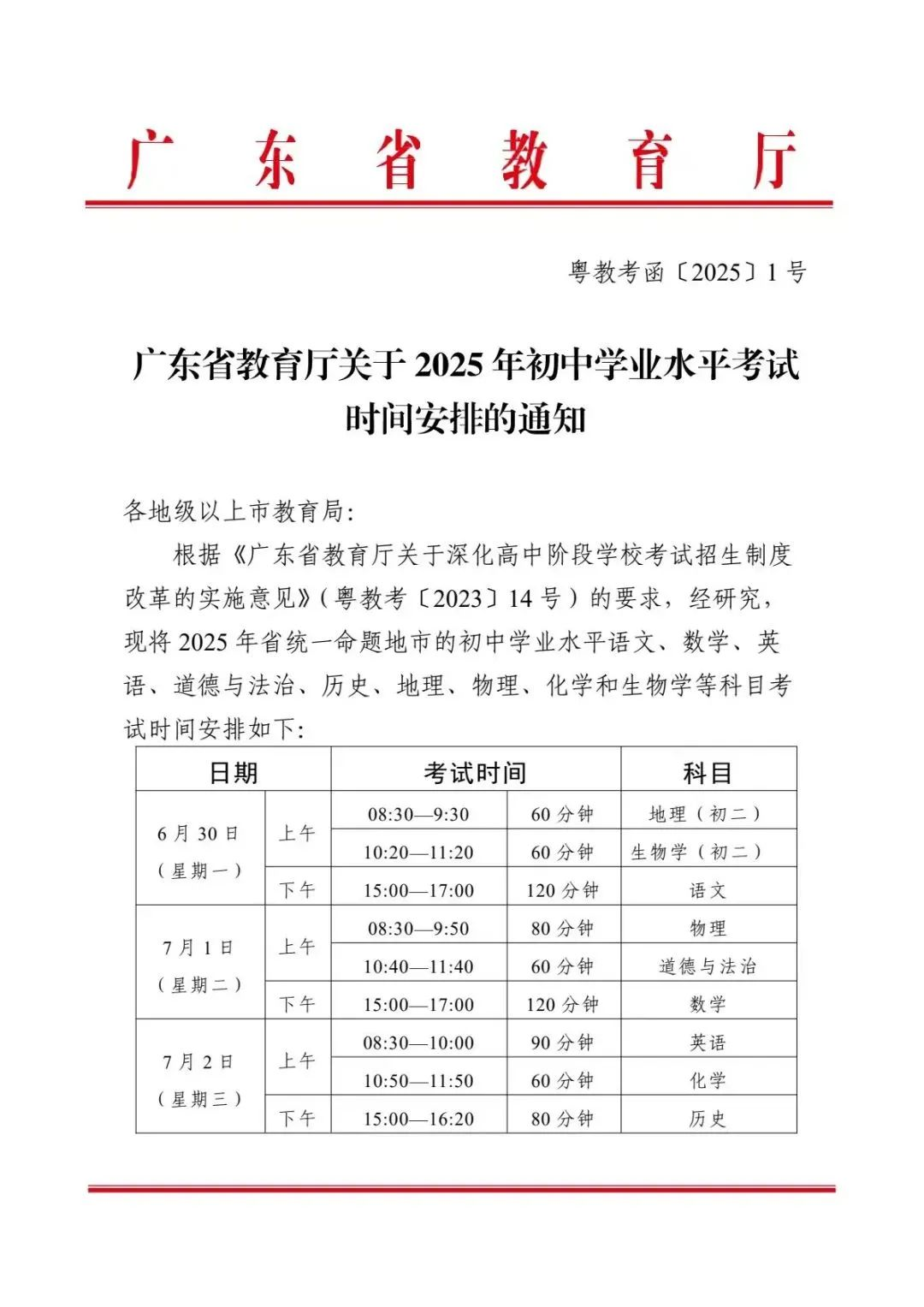 近日,广东省教育厅发布了《广东省教育厅关于2025年初中学业水平考试时间安排的通知》,明确了2025年广东省统一命题地市的中考时间。此次考试将于6月30日至7月2日进行,涉及的科目包括道德与法治、语文、历史、数学、外语、地理、物理、化学和生物学。