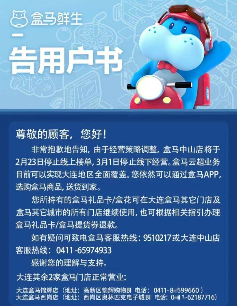 开头网友传的盒马关门,确实是存在的, 2 月底大连盒马门店就宣布停业。不过,盒马一向开关门速度飞快,效益不好了就直接砍掉。