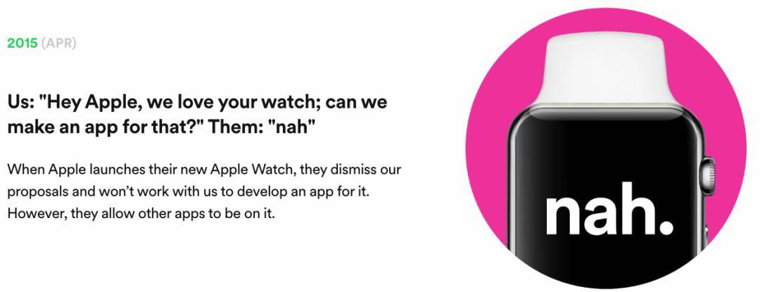 当苹果推出 Apple Watch 新品时,还故意卡 Spotify 时间,拖延他们制作手表端 App 的速度( 苹果方面称大量应用开发进度相仿,并没有故意刁难 Spotify )。