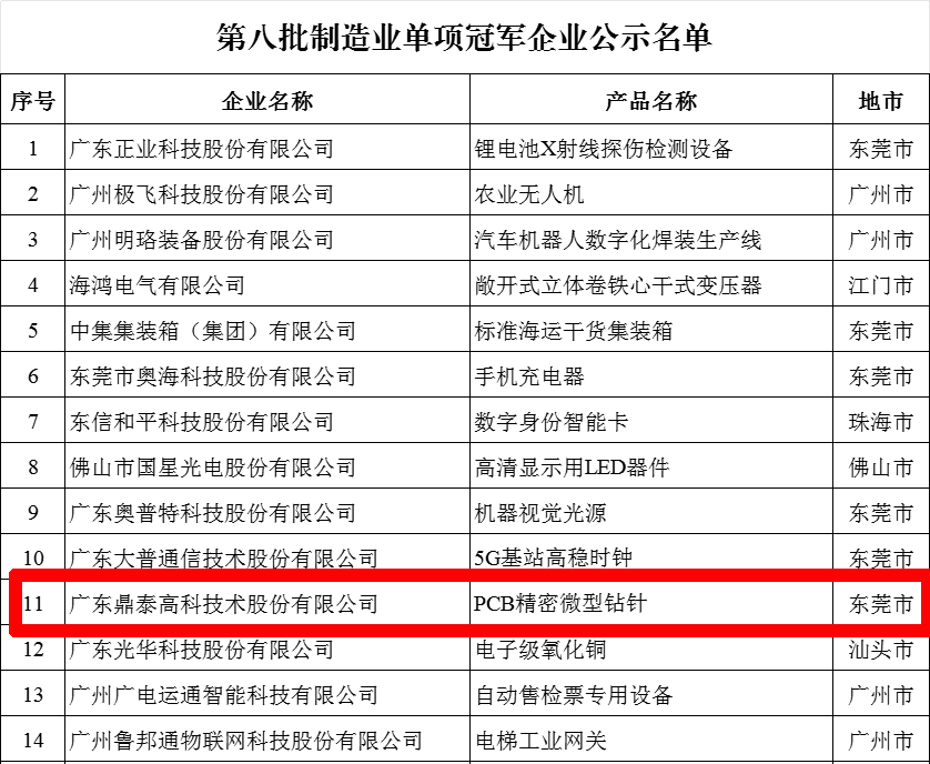 近日,全国第八批制造业单项冠军企业公示名单发布。根据广东省工业和信息化厅公示名单,东莞共有10家企业入选。其中,总部位于厚街的广东鼎泰高科技术股份有限公司(简称“鼎泰高科”)名列其中。这意味着厚街在国家级制造业单项冠军企业(产品)培育工作中,实现了零的突破。