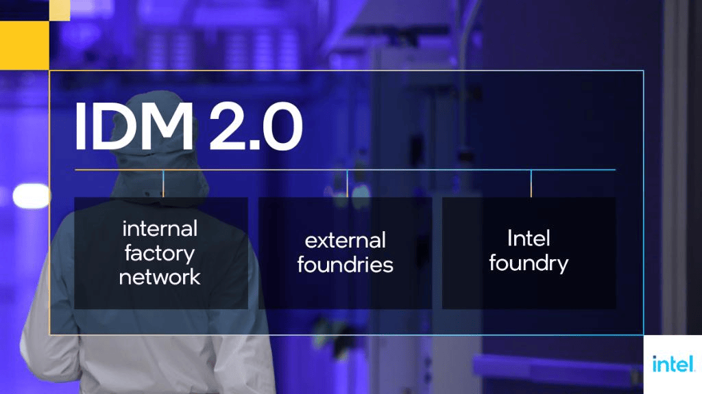 英特尔这边, 2021 年就搞了个大动作,宣布 IDM 2.0 计划,总结下来,就是它也要学台积电,扩张产能准备代工,还为此专门成立了一个代工服务事业部。