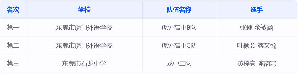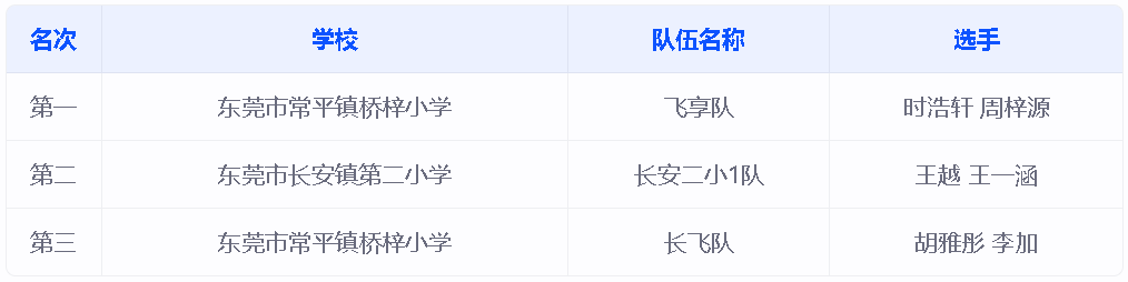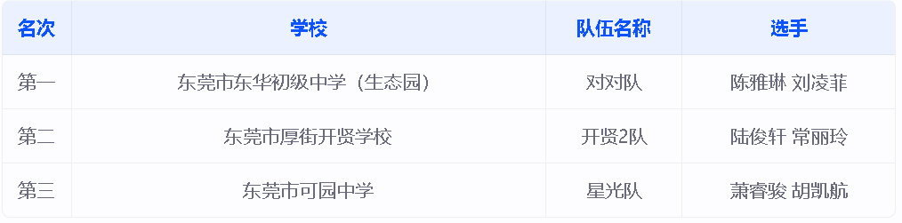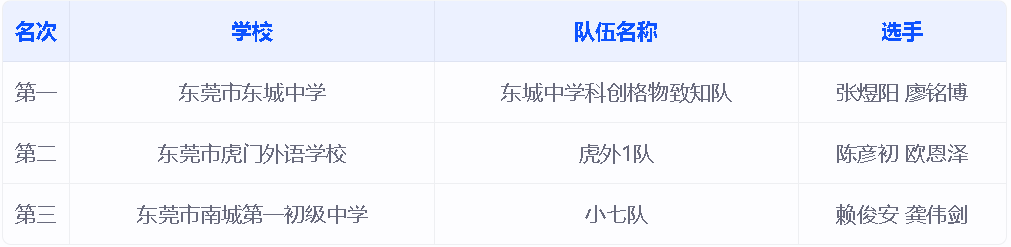 经过激烈角逐,各项目优胜队伍脱颖而出。木牛流马项目初中组前三名分别由东莞市东城中学、东莞市虎门外语学校和东莞市南城第一初级中学获得;高中组前三名由东莞市虎门外语学校包揽;小学组前三名则由东莞市厚街竹溪小学、东莞市长安镇实验小学和东莞市黄江育英小学获得。牙签搭塔项目初中组前三名分别由东莞市东华初级中学(生态园)、东莞市厚街开贤学校和东莞市可园中学获得。纸箭飞梭项目前三名由东莞市常平镇桥梓小学、东莞市长安镇第二小学和东莞市常平镇桥梓小学获得。