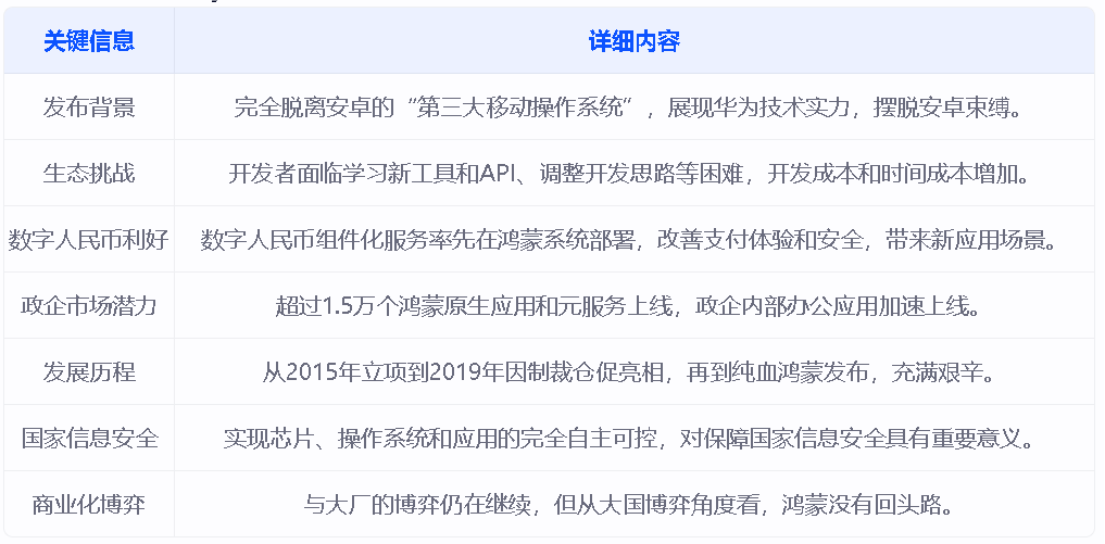 回顾华为鸿蒙的发展历程,从2015年立项针对物联网设计,到2019年因美国制裁而仓促亮相,再到如今的纯血鸿蒙发布,华为鸿蒙经历了诸多艰辛。在解决缺芯问题后,华为手机销量暴增,使得操作系统问题受到真正重视。HarmonyOS NEXT的推出,不仅是华为在制裁之下的被迫之举,也是其追求自主可控的重要一步。成功之后,华为将能像苹果那样,实现芯片、操作系统和应用的完全自主可控,这对于保障国家信息安全具有重要意义。