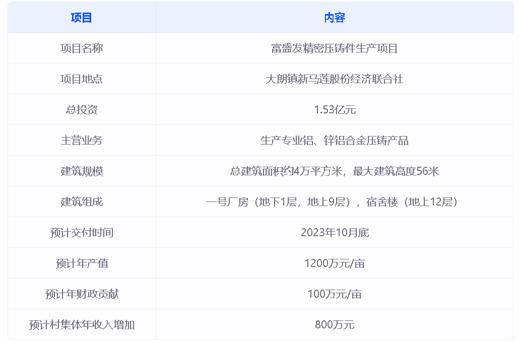 据了解,大朗镇新马莲股份经济联合社——富盛发精密压铸件生产项目,总投资1.53亿元,主营生产专业铝、锌铝合金压铸产品,是市增资扩产项目。项目达产后,年产值将达到1200万元/亩,年财政贡献达100万元/亩,预计每年为村集体增加800万元收入。