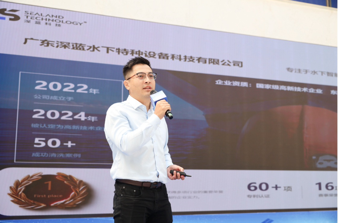 广东深蓝水下特种设备科技有限公司联合创始人、CEO李昶兴指出了海洋运输与海洋工程领域的长期痛点,并介绍了公司的创新产品——“MANATEE5.0”水下清洗机器人。这款机器人集成了多个核心技术,能够在复杂水下环境中高效工作,大幅提高清洗效率并降低风险。深蓝科技已成功完成50多个清洗案例,其水下机器人正逐步覆盖更多场景,为海洋经济绿色发展注入智能动力。