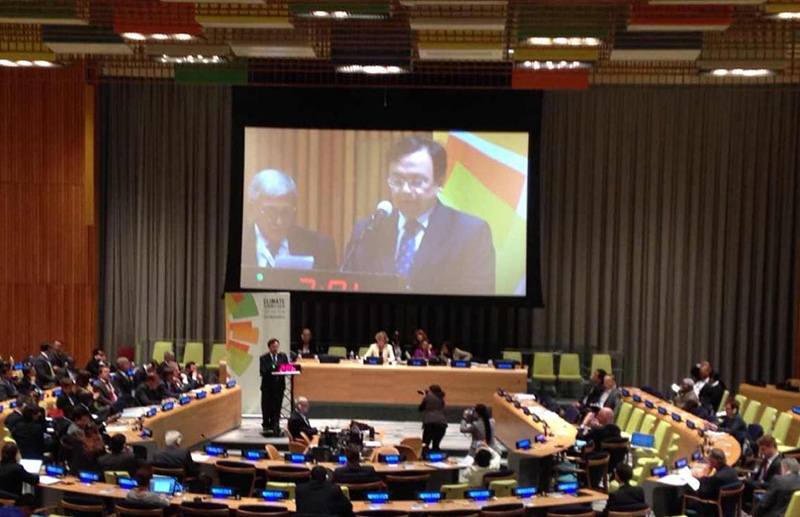 当地时间2014年9月23日,巴黎气候变化大会前最为重要的大会——2014年联合国气候峰会在纽约联合国总部隆重举行,来自全球120多个国家的元首和政府首脑齐聚一堂,共同商讨全球气候变化问题。应时任联合国秘书长潘基文邀请,比亚迪股份有限公司董事长兼总裁王传福作为全球唯一被邀请的汽车企业代表,出席峰会并发表演讲。王传福指出,城市公交电动化是快速提升城市空气质量的最佳途径,全球将迎来城市公交电动化的交通革命。会上,王传福呼吁各国将电动汽车引入到更广泛的城市交通领域,并预测:不久的将来,光伏发电及新能源汽车将会成为世界各国的重中之重。