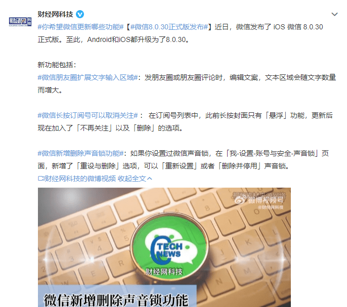微信新增删除声音锁功能,说实话,这是第一次听说这个功能,不过看很多小伙伴说,这个并不好用,自从设置了之后,一次没成功过,删除了更好。也有小伙伴表示这个很好玩,而且如果忘记密码,或者切换账号之后用这个更方便。大家都更新了吗?