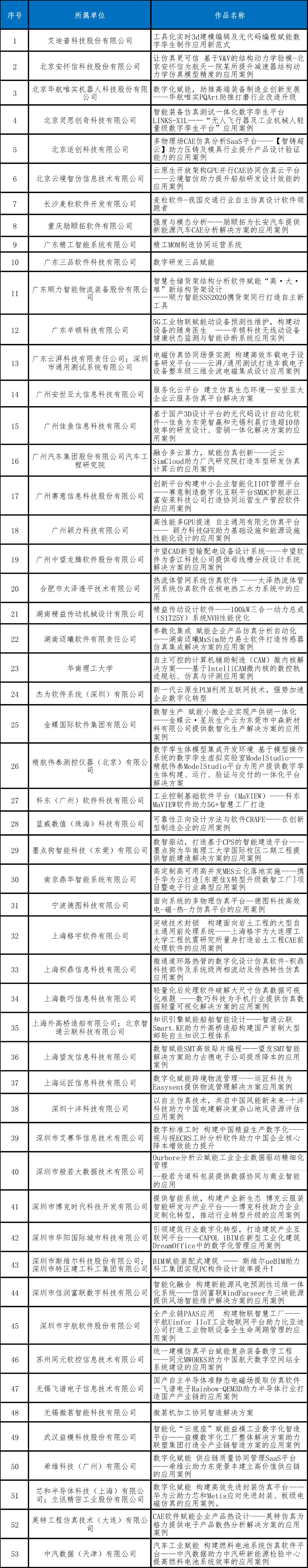 由于本届大赛申报案例质量高、行业应用代表性强,为鼓励国内工业软件实践应用推广,经大赛组委会研究决定,入围名额由50名增加至53名。最终遴选出53个技术先进、成效显著、能复制推广的工业软件优秀实践案例晋级决赛。
