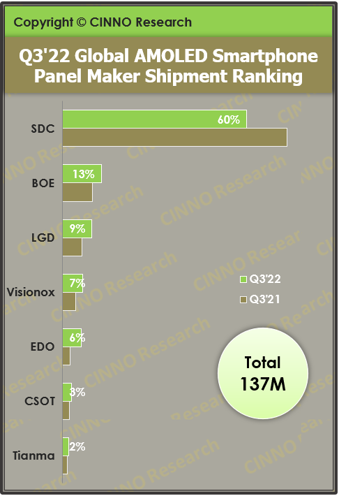 虽然我国的OLED显示技术稍逊于三星和LG,但凭借价格优势,我们还是取得相当不错的增长。CINNO Research数据显示,今年第三季度,国产智能手机OLED面板在全球市场的份额达到30%,相较去年同期的20%增长超过10%。其中,京东方一家的份额就达到13%,仅次于三星位居第二名,维信诺以7%的份额排名第四。而今,有越来越多手机厂商都在优先采用国产OLED屏幕,这也推动了国产面板厂商的不断前进,不断缩小与三星的差距。