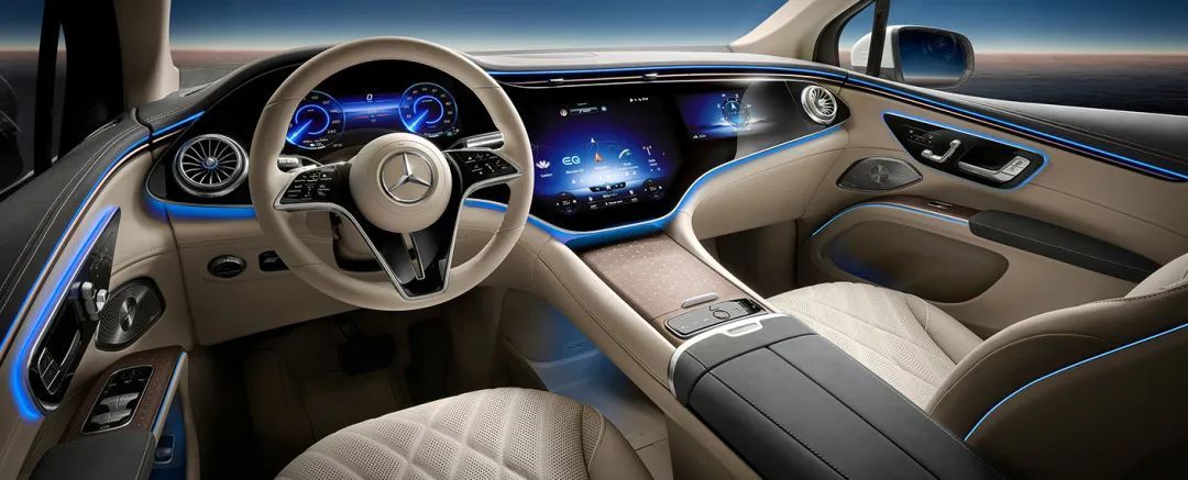 另一个对屏幕需求量极大的行业,那必然就属智能汽车了。现在很多新上市的车型均配备有大尺寸中控屏,一部分还有副驾娱乐屏、抬头显HUD,甚至连仪表盘开始换成了屏幕显示。奔驰EQS纯电SUV的中控就配备一块长达1.41米的MBUX超联屏,将仪表盘、中控屏和副驾驶娱乐屏连接在一起,达成多屏互联的效果,抬高了内饰的科技感和高级感。