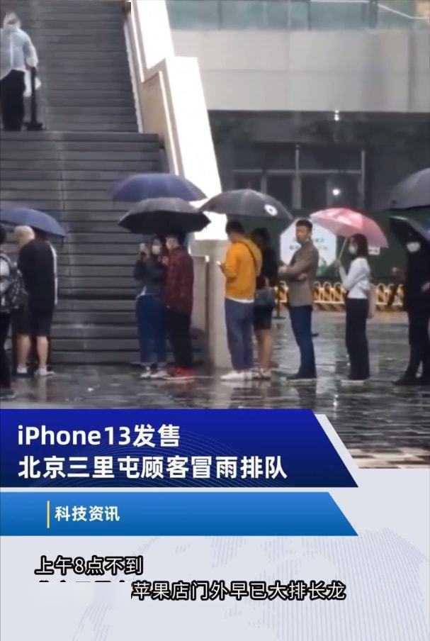 且不管已经存在的bug,iPhone13开售,为了第一时间拿到新机,不少粉丝在苹果店外冒雨排长龙等候,甚至有黄牛加价千元倒卖牟取利益。