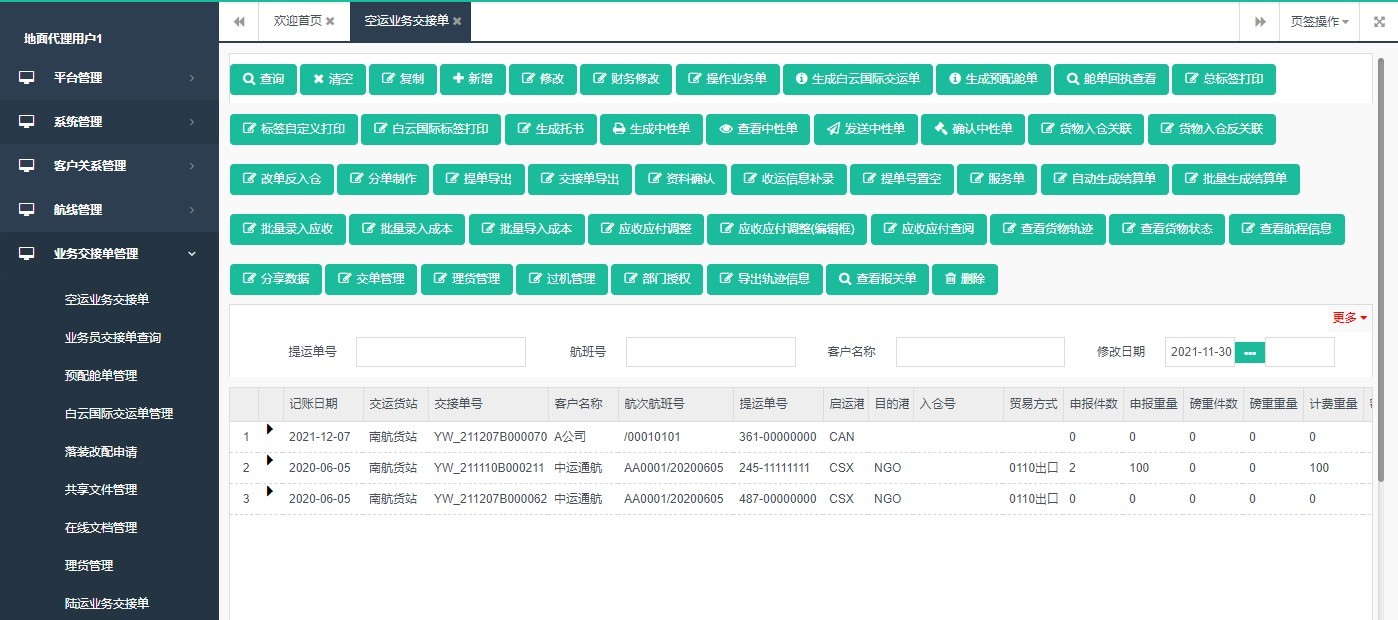 公路舱单管理系统,主要包含了公路预配舱单,重车确报、空车确报,落装、改配等操作,确保了预配舱单数据源的准确性,减少因人工失误带来的损失,且实现了数据的申报与回执的接收,方便快捷,提高了数据操作的整体效率。