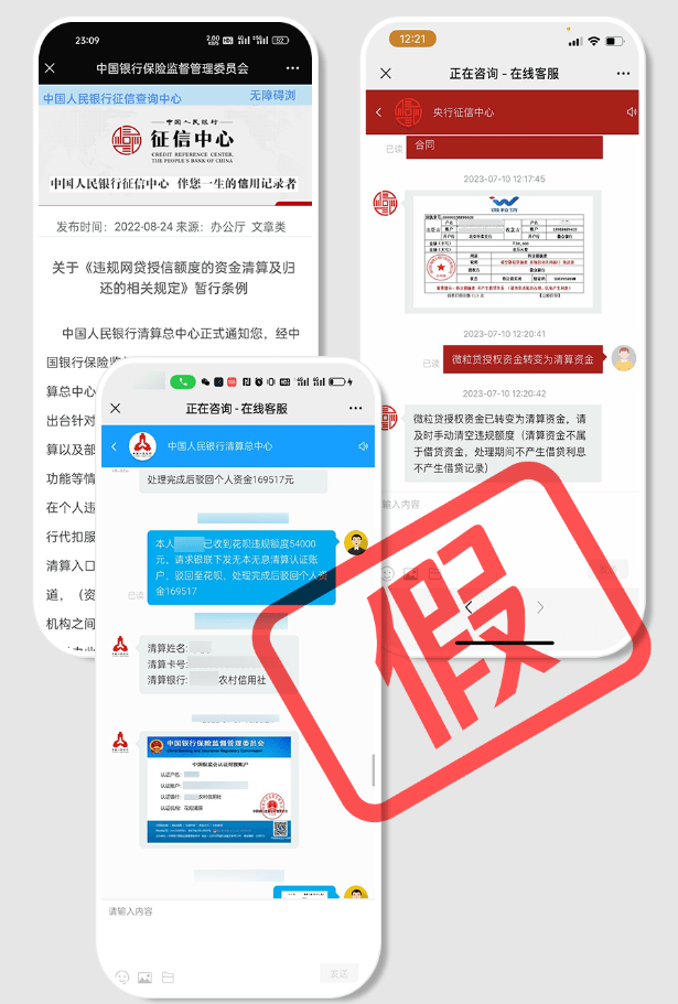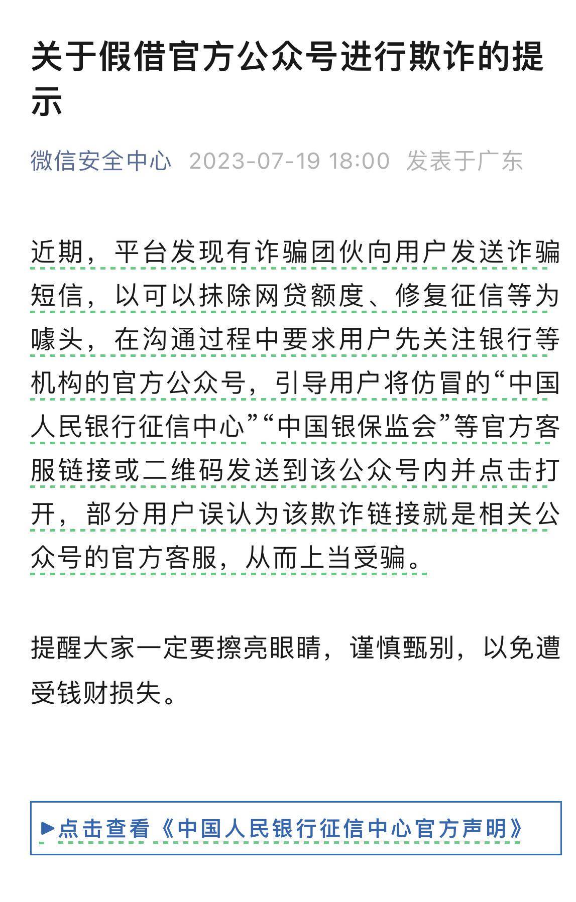 微信称:平台近期发现有诈骗团伙向用户发送诈骗短信,以可以抹除网贷额度、修复征信等为噱头,在沟通过程中要求用户先关注银行等机构的官方公众号,引导用户将仿冒的“中国人民银行征信中心”“中国银保监会”等官方客服链接或二维码发送到该公众号内并点击打开,部分用户误认为该欺诈链接就是相关公众号的官方客服,从而上当受骗。