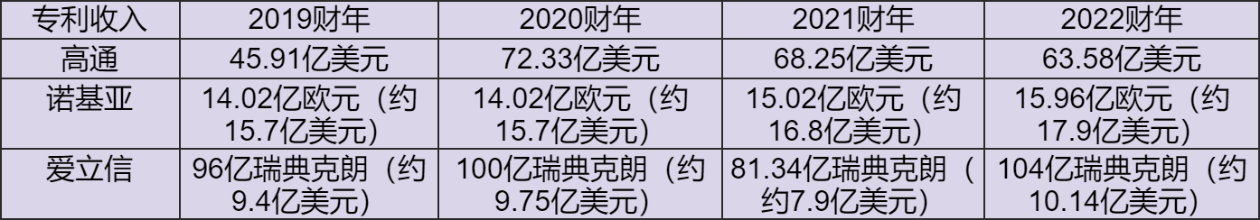 2019-2022财年,高通知识产权总收入约250亿美元,诺基亚约66亿美元,爱立信约37亿美元。