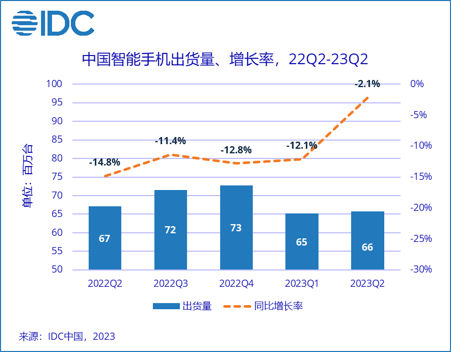 7 月 27 日,市场研究公司 IDC 的报告显示,第二季度中国手机市场出货量约为 6570 万台,同比下降 2.1%,对比去年同期的下滑 14.8%和上季度的下滑 12.1%,降幅明显缩窄。