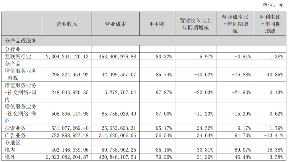 在前三大业务中,广告业务和搜索业务均实现了增长,相比2022年上半年,该两项业务收入同比增长分别为34.64%和24.56%,而海外社交网络业务收入同比下降11.23%。