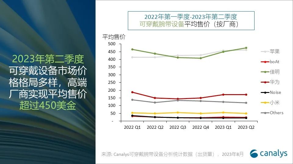 2023年第二季度,厂商推出一系列新品,以增强市场份额。例如,小米和华为推出了价格实惠的基础手环和手表,满足各类消费者的偏好。印度厂商也效仿而行,像Noise这样的品牌推出入门级型号,同时还推出多种价位段的产品,以满足更多的客户群。Fire Boltt进一步降价,以低于19美元的平均售价为消费者提供卓越的用户体验。
