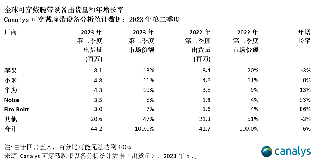 第三方数据机构Canalys近日发布报告显示,2023年第二季度,全球可穿戴腕带设备出货量达4400万台,同比增长了6%。