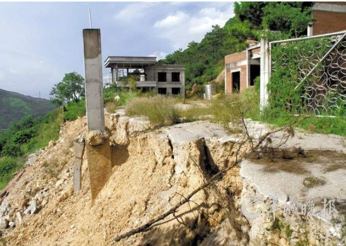 蔡树生毁林违建两栋别墅,因水土流失山体滑坡而拆除一栋,现场一片狼藉,严重影响公园景观。