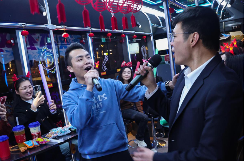 记者在现场看到,从东坑镇政府发车后,“行运巴士”仿佛变成了一个移动的舞台,载歌载舞,热闹非凡。车内灯光璀璨夺目,为整个空间营造出一种梦幻般的氛围。乘客们随着乐队的歌声挥舞着手中的荧光棒和灯牌,拍掌唱歌,尽情享受着音乐的美妙。随着巴士的行进,窗外的风景逐帧变换,上演了一场视觉的盛宴。