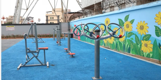 除了舒适整洁的环境外,公园一侧还设有电动自行车停放充电点,为周边群众提供安全便捷的停放场所,并设有各式运动健身器材,为群众打造出可休憩、可健身的绿色共享空间。