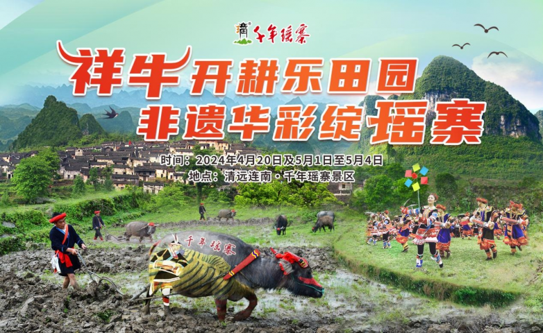 每年的农历三月三,是连南瑶族重要的传统节日——“开耕节”,又称“踏青节”,意为一年春耕开始。连南当地会举行盛大的开耕仪式,当地群众也会盛装出行、鸣炮开耕,唱响劳动歌,敬奉土地神和祖先神灵,牵引家中耕牛来到田间,用犁头翻耘沃土,满怀期待地播下希望的稻种,奏响春耕的信号,以此祈盼风调雨顺,五谷丰登。为了让广大游客领略瑶族悠久的历史文化内涵、梯田风光、体验农耕乐趣,清远千年瑶寨景区将在4月20日、5月1日—5月4日举办“祥牛开耕乐田园 非遗华彩绽瑶寨”开耕节活动。