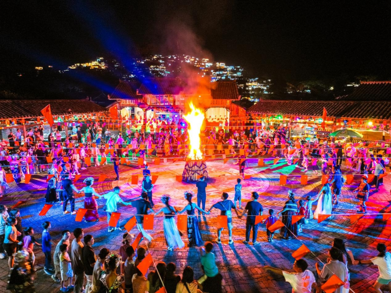 夜幕降临,参加一场载歌载舞的篝火晚会,瑶族风情歌舞、喷火表演等节目浸润整个晚会,带你沉浸式感受瑶族独特风韵,还可以体验瑶族接待贵宾的最高敬酒礼节——“源远流长”敬酒礼(2024年已获“国家版权登记”),感受瑶族人的热情好客。和瑶族莎腰妹、阿贵哥手牵手,围着篝火,齐跳民族大团结舞,共同欢庆瑶族开耕节的到来,许下对未来美好生活的期望。
